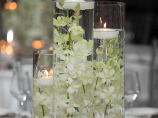 Una opción elegante y minimalista es usar flores sumergidas en agua dentro de jarrones de cristal. Añade velas flotantes para un toque romántico adicional. Este estilo es particularmente efectivo en bodas nocturnas, ya que las velas crean una iluminación suave y mágica.