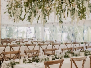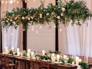 Los centros de mesa colgantes son una tendencia que aporta un toque mágico y sofisticado. Utiliza aros decorativos, candelabros o estructuras geométricas adornadas con flores y follaje. Este tipo de decoración no solo ahorra espacio en la mesa, sino que también crea un efecto visual impresionante desde cualquier ángulo del salón.