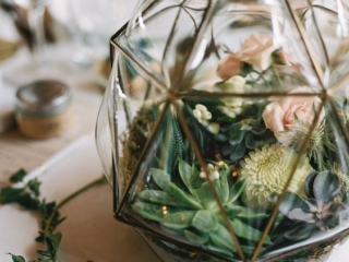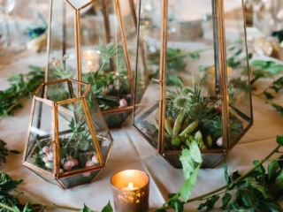 Incorporar terrarios de cristal como centros de mesa es una opción moderna y elegante. Rellénalos con suculentas, musgo y pequeñas flores. Los terrarios pueden personalizarse con detalles adicionales como piedras decorativas o luces LED para un toque de brillo.